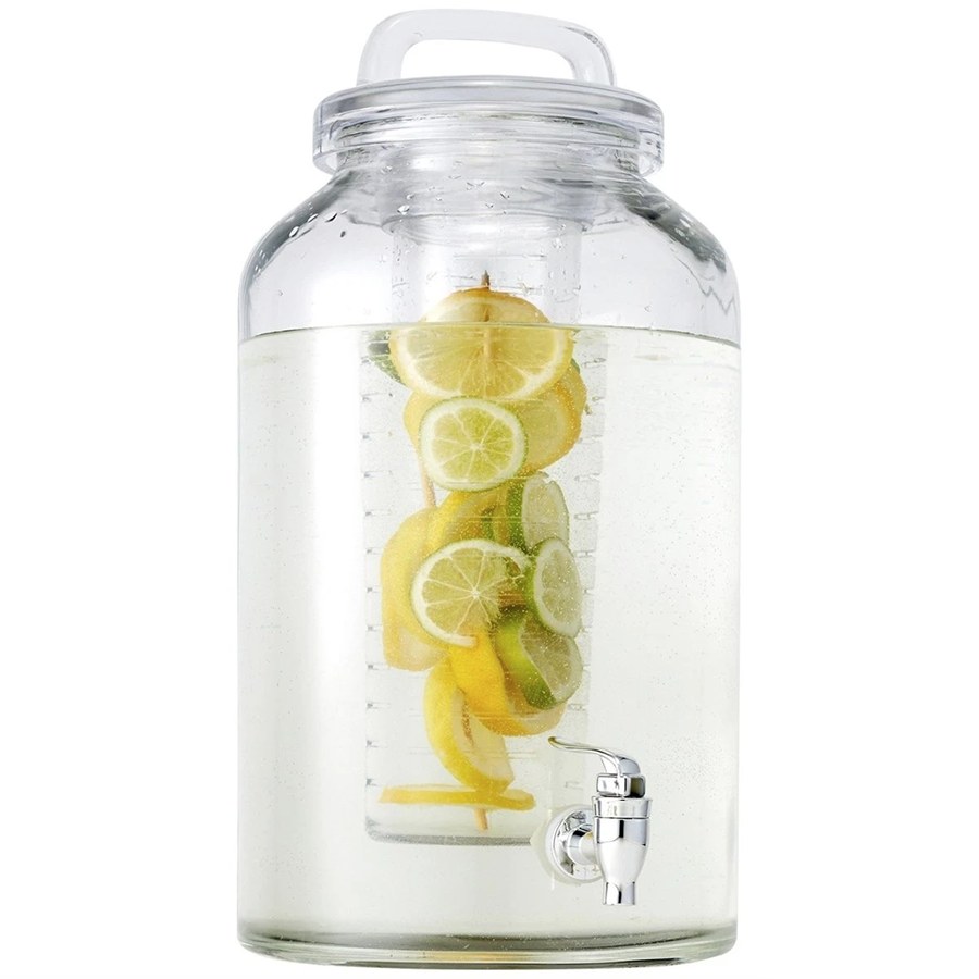 Лимонадник оснащен краном из пластика, стеклянной крышкой и пластиковым инфьюзером.