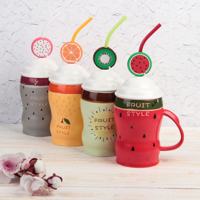 Кружка с крышкой и трубочкой Litchi style, 300 мл, 8,5 см, 15 см, Керамика, Deco