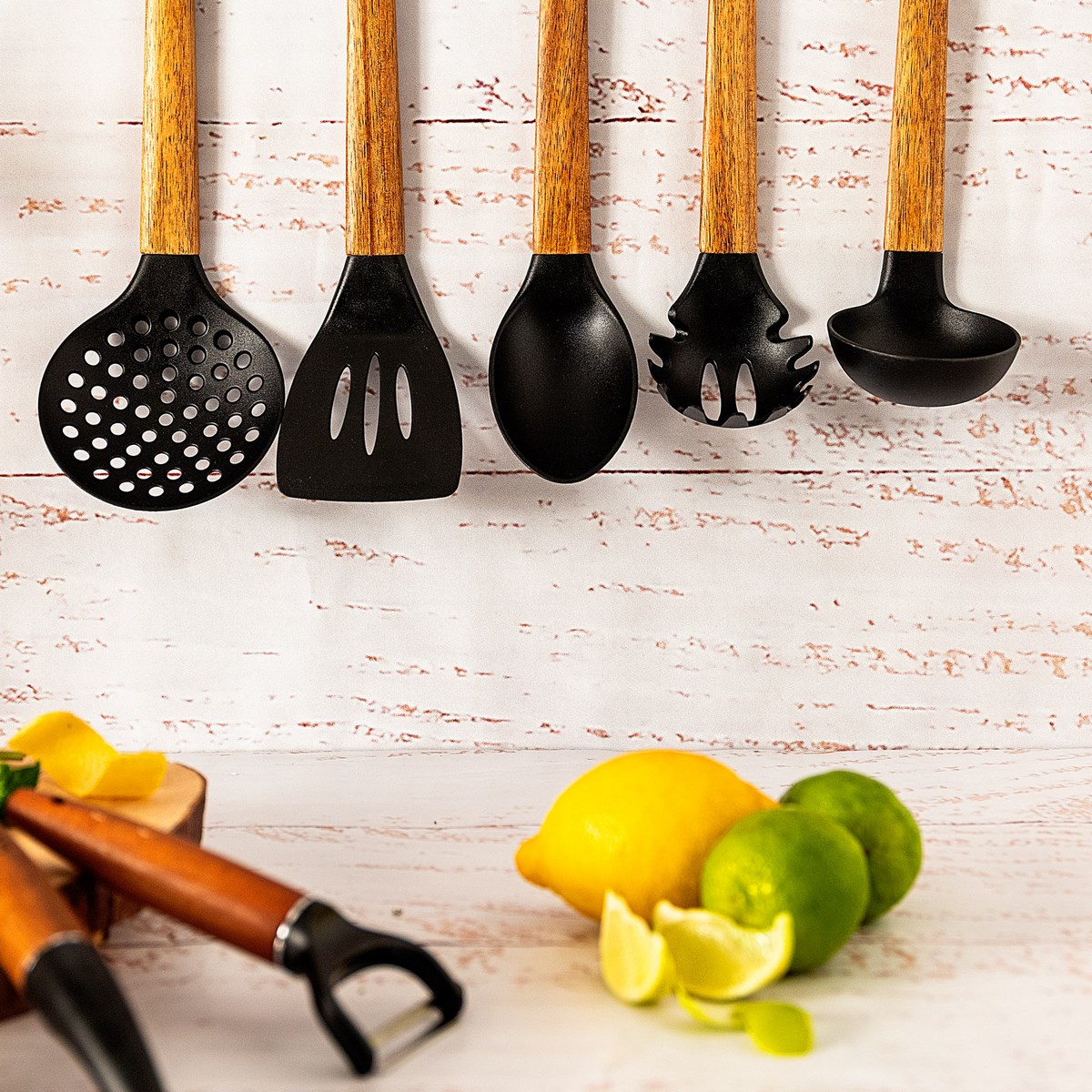Ручка изготовлена из акации, а нижняя часть – из нейлона, благодаря чему может использоваться в сочетании с кухонной посудой с антипригарными и другими деликатными покрытиями.