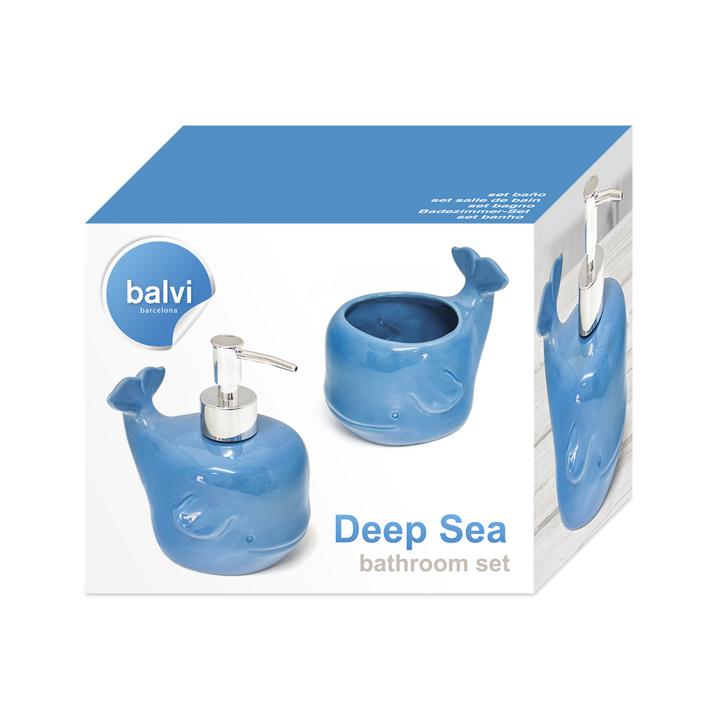 ищите значокНабор для ванной комнаты Deep Sea от испанского бренда Balvi состоит из емкости для жидкого мыла с дозатором и стакана для зубных щеток. Вы можете использовать емкости также для других ванных принадлежностей, например, геля для душа и соли для ванной.