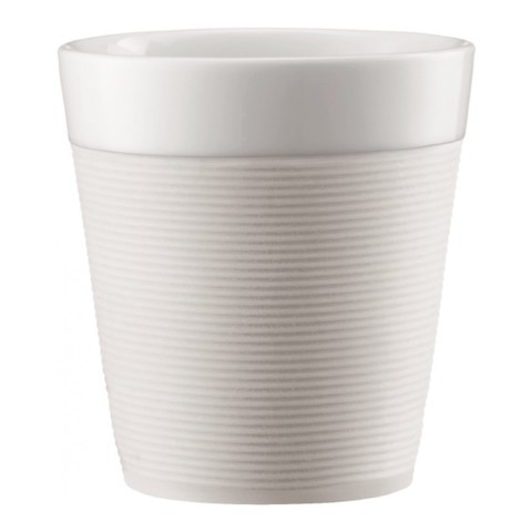 Это удобные кружки из классической коллекции швейцарского бренда BODUM. На кружки надет силиконовый чехол. Он выполняет одновременно три функции. Во-первых, он не дает вам обжечься о нагревшуюся от горячего напитка поверхность (и именно поэтому такой кружке не нужна ручка), во-вторых, благодаря тому, что ободок ребристый, кружка не скользит в руке. В-третьих, ободок выполняет роль амортизатора случайных ударов и защищает фарфор от трещин и сколов.
