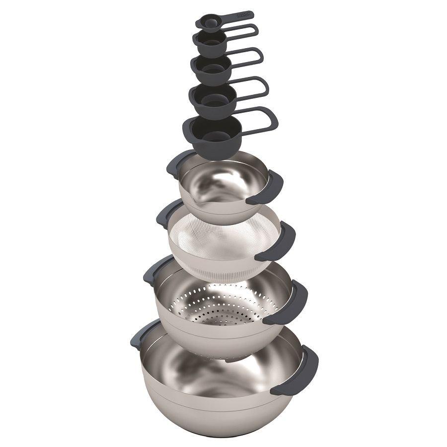 ищите значокБестселлер от Joseph Joseph в эксклюзивном варианте коллекции 100 из нержавеющей стали. В набор входит 9 емкостей и инструментов для готовки. Все предметы оснащены удобными ручками и нескользящим дном. Благодаря инновационному дизайну емкости компактно складываются одну в другую и занимают абсолютный минимум места — где бы они ни хранились. В набор входит: - Малая миска с мерными делениями – 0,5 л. - Сито – 1,65 л. - Дуршлаг – 3 л. - Большая миска с нескользящим дном – 4,5 л. - 5 чаш для измерения ингредиентов объемом: 1 столовая ложка (плюс есть возможность отмерить 1 чайную ложку) - 15 мл. (5 мл.) 1/4 стакана – 60 мл. 1/3 стакана – 80 мл. 1/2 стакана – 125 мл. 1 стакан – 250 мл.