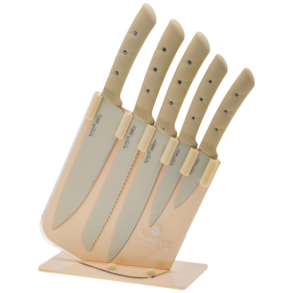 ищите значокНож - главный инструмент на кухне, а вернее ножи, т.к. даже самый лучший нож не сможет справиться со всем многообразием задач. Выбирая набор ножей Rhinestones Agness - Вы приобретаете комплект самых необходимых и чаще всего используемых ножей. Нельзя мыть в посудомоечной машине и использовать в микроволновой печи.