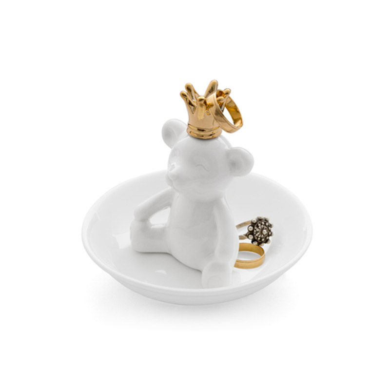 ищите значокЕсли вы любите менять кольца каждый день, то подставка для колец The King вам точно пригодится. Это милый медвежонок в короне, сидящий на тарелке. Кольца, которые в данный момент не одеты вами, можно повесить прямо ему на корону. А если не хватит места, то можно просто положить их на тарелочку. В любом случае они будут все в одном месте, и не придется тратить время на их поиски. Подставка выполнена из белой керамики, а корона – золотистого цвета, что символизирует наличие на ней золотых ювелирных украшений.