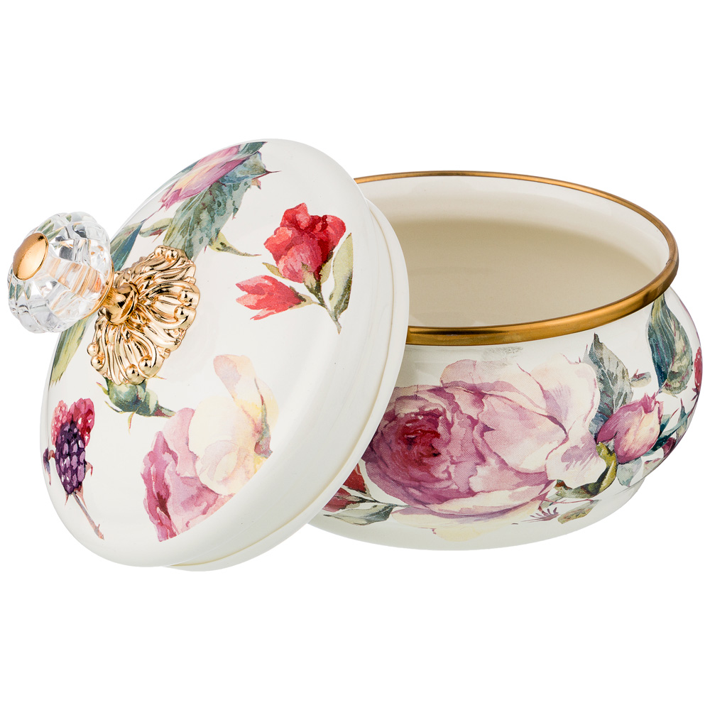 ищите значокЭлегантная эмалированная сахарница Vintage Flower украшена утонченным цветочным дизайном, выполненным в технике деколи. Сахарница закрывается крышкой с удобной и роскошной ручкой. Такая сахарница украсит ваш стол и станет неотъемлемым атрибутом повседневного и праздничного чаепития.