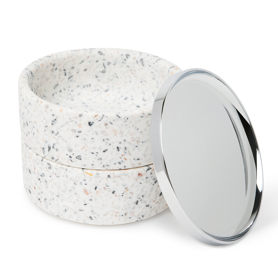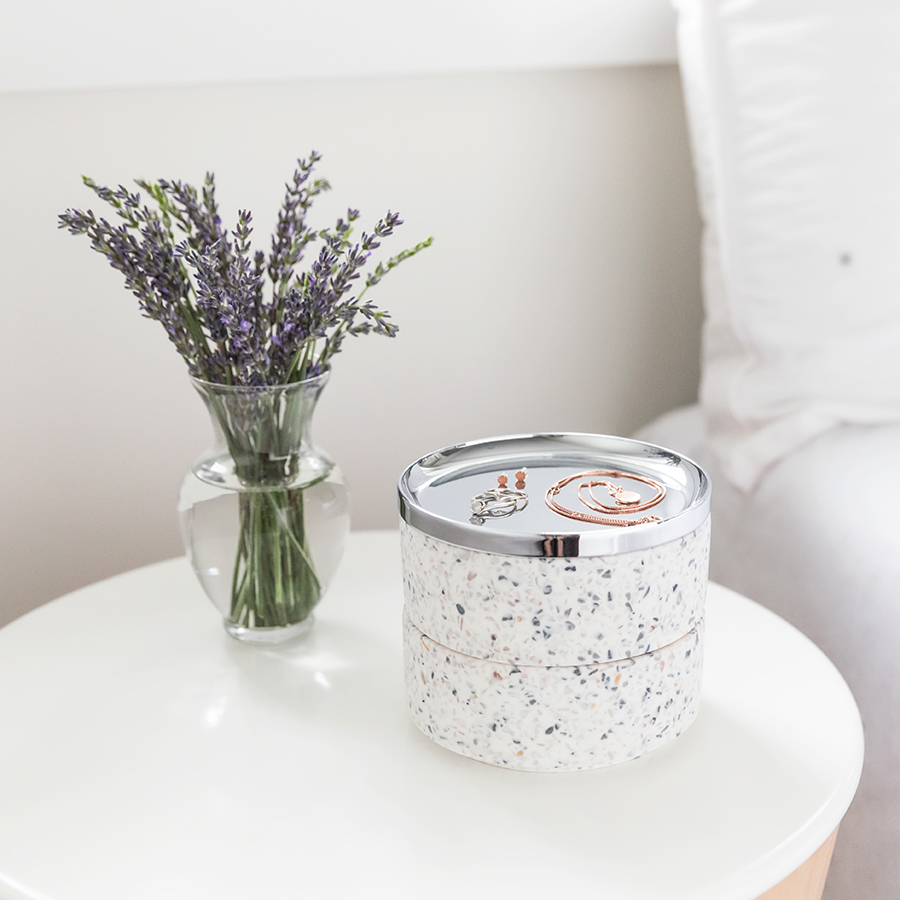 ищите значокШкатулка для украшений Tesora Terrazzo White состоит из двух съемных отделений. Главная особенность изделия – отделка под мрамор. Металлическая крышка закрывает верхнее отделение и служит дополнительным местом для хранения. Аксессуар отлично подойдет для мелких украшений: колец, браслетов, кулонов, цепочек, брошей и т.д. Шкатулку можно поставить на прикроватную тумбу или комод. Она составит гармоничный дуэт с другими предметами из серии Tesora, позволяя удобно и компактно хранить все украшения