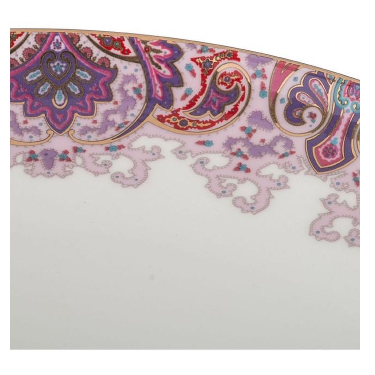 ищите значокФарфоровая чаша на ножке для сервировки фруктов, украшенная сложным узором в фиолетовых тонах.