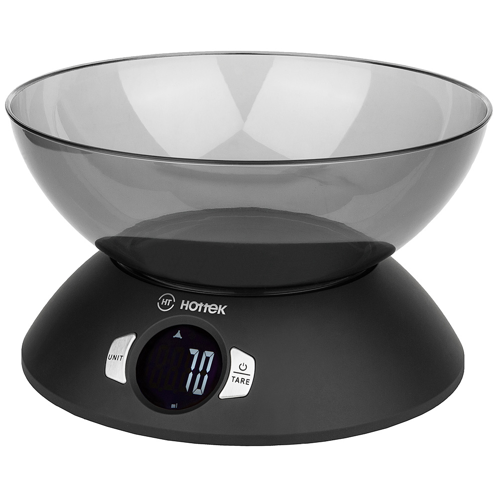 ищите значокЭлектронные кухонные весы измеряют массу овощей, мяса, рыбы, специй, пряностей и круп с точностью до 0.001 кг. В комплекте идет пластиковая чаша 2 л. В нее насыпают крупы или наливают жидкости для измерения веса/объема. На устройстве можно задать удобную для вас единицу измерения: в граммах (g), унциях (oz), или в миллилитрах (ml). Функция тарирования позволяет при взвешивании не учитывать массу емкости, в которой лежат продукты. Максимально допустимая масса взвешивания - 5 кг. При перевесе загорится индикатор перегруза. На LCD-дисплее с подсветкой расположен индикатор разряда батареи. Кухонные весы работают от 2 батареек типа "ААА" (в комплекте).